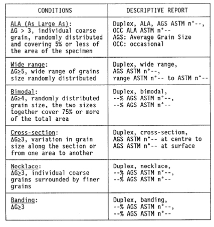 下表中從SNECMA文檔中詳細闡述了ASTM E-1181中描述的與雙相晶粒尺寸相關的其他術語: