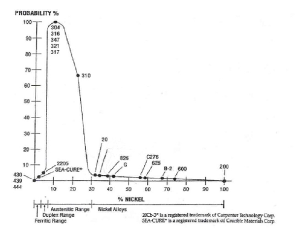 當我們考慮特殊合金中的氯化物誘導的SCC時,鎳含量是影響合金敏感性的主要因素。以下曲線根據合金的鎳含量,表明該合金開裂的可能性。