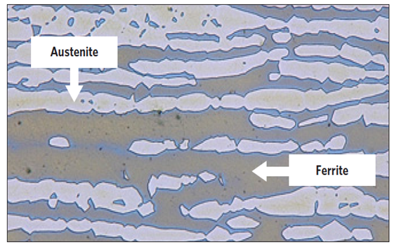 幾乎沒有鎳的碳鋼和鐵素體不銹鋼都不會經歷Cl-SCC,也不會經歷高鎳合金(鎳含量超過30%的合金不易開裂)。雙相不銹鋼由于其顯微組織中的鐵素體(請參見下圖),因此具有相同的耐性。盡管奧氏體允許SCC,但鐵素體微結構在裂紋擴展之前將其固定。