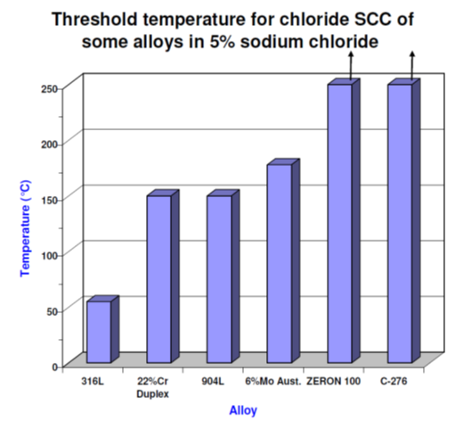 當氯化物濃度超過1000 ppm時,請勿使用316L。在非酸性環境中,22Cr(2205)雙相材料可以耐受高達8-10,000 ppm的氯化物含量。超級雙相材料(例如我們的Zeron?100)和超級奧氏體合金(例如軋制合金的AL-6XN?)可用于氯化物含量高達50,000 ppm的環境中。超級雙相不銹鋼和超級奧氏體不銹鋼被認為實際上不受氯離子應力開裂的影響。
